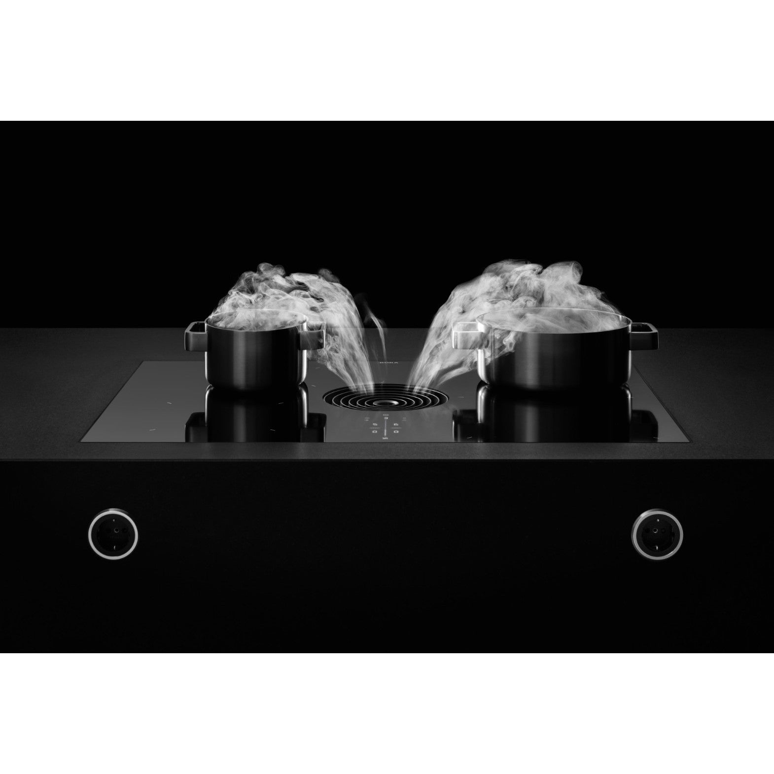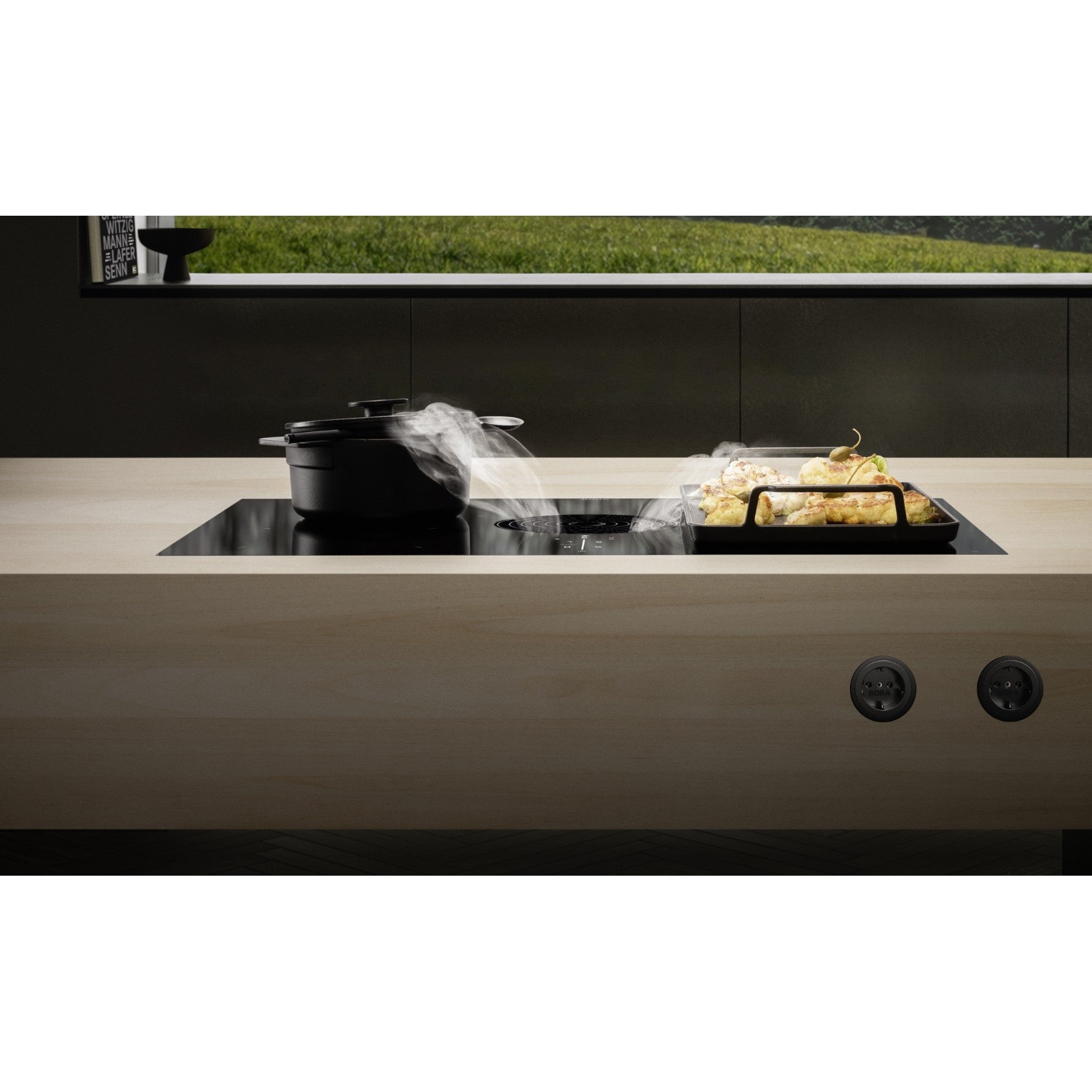 The most flexible of our compact cooktop extractor systems. Suitable for cookware of all shapes and sizes. From large roasters to small pots, thanks to the zone induction areas on the left and the surface induction zones on the right everything is optimally recognised.
