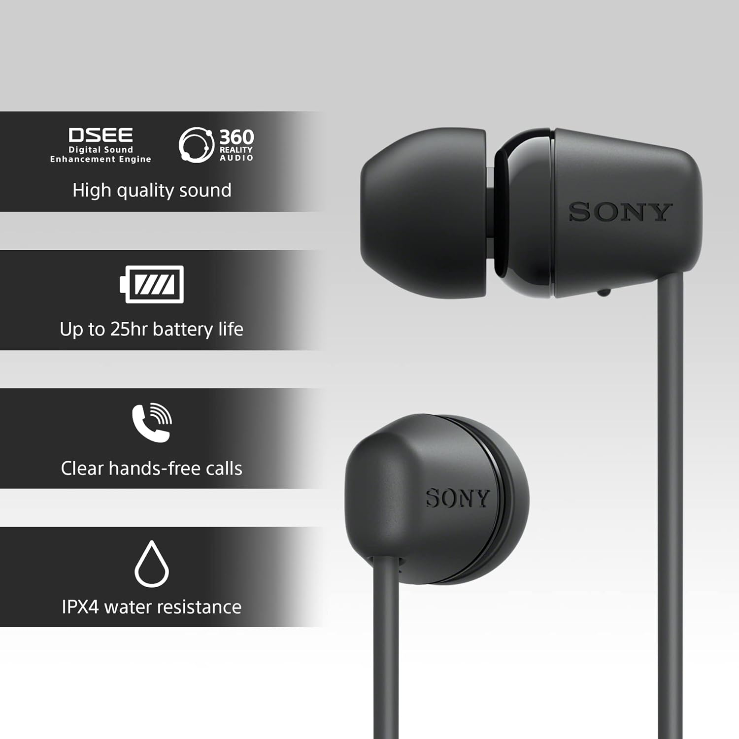 The WI-C100 redefine entry-level wireless in-ear headphones. With Sony’s exceptional sound quality, they offer a rich listening experience while a long 25hr battery life and splash-proof design give you peace of mind when you’re out and about. They’re also compatible with the Sony | Headphones Connect app, so you can adjust sound to suit your tastes.