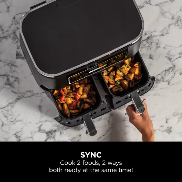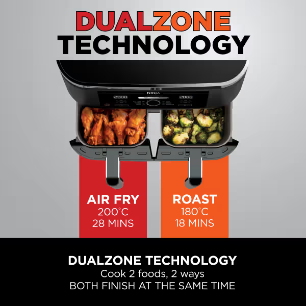 Meet the air fryer that cooks 2 foods, 2 ways, and finishes at the same time. Ninja’s popular Dual Zone Air Fryer is now available with 4 cooking functions – Air Fry, Max Crisp, Roast and Reheat. The perfect first Dual Zone air fryer for couples and families, with easy-to-use digital controls and endless meal-making possibilities.