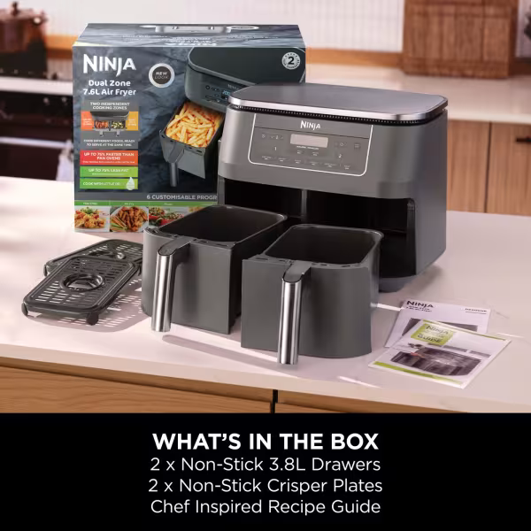 Easy to clean: The non-stick drawers and crisper plates are dishwasher-safe for easy clean-up. Get started straight away: There’s a Chef-Created Recipe Guide included in the box, packed with Ninja Air Fryer recipes to kick-start your imagination.