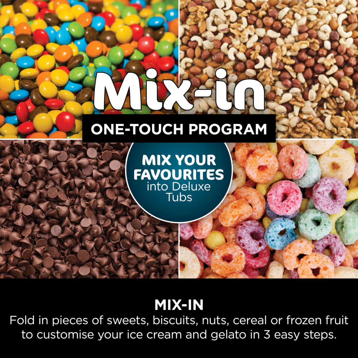 Bigger capacity Deluxe Tubs allow you to enjoy two different mix-ins in the same ice cream, gelato or frozen yoghurt base for endless flavour combinations using the ‘Top’ and ‘Bottom’ processing settings. Create a chocolate base, then customise with nuts on top and pretzel pieces on the bottom.