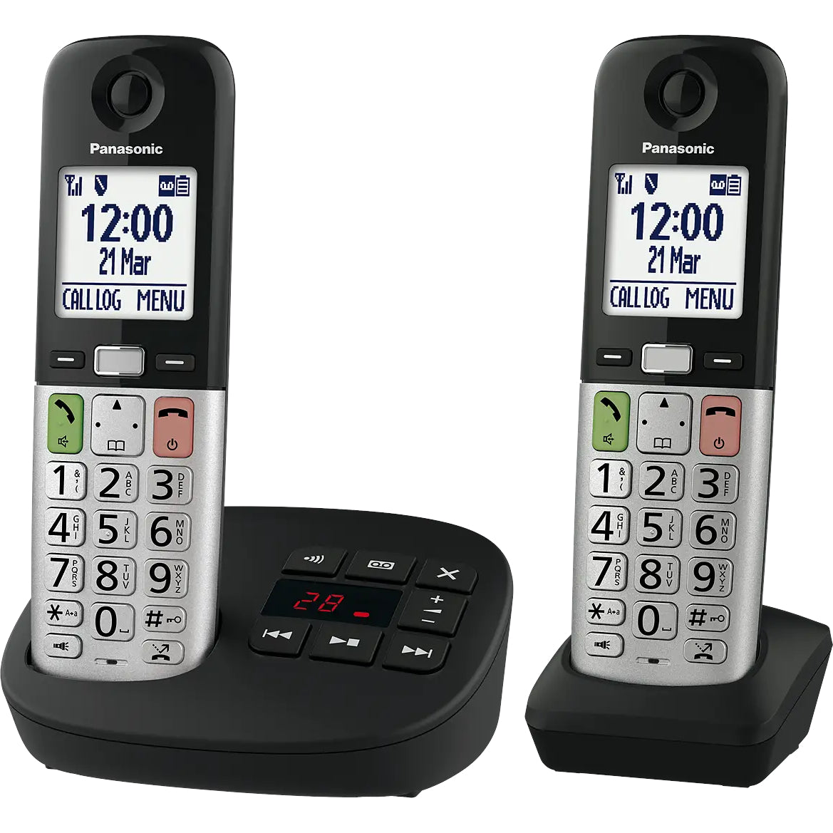 Digital cordless phone with answering machine, a large 2.1-inch display, amplified volume, Fav Call feature, convenient torchlight, various call blocking functions, and hearing aid compatibility support. 1 x additional handset with charge station included.