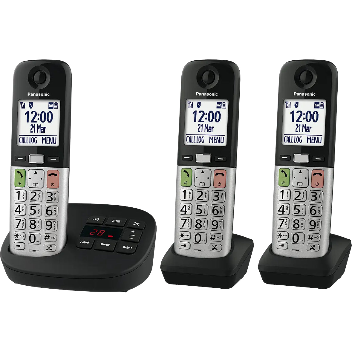 Digital cordless phone with answering machine, a large 2.1-inch display, amplified volume, Fav Call feature, convenient torchlight, various call blocking functions, and hearing aid compatibility support. 2 x additional handset with charge station included.