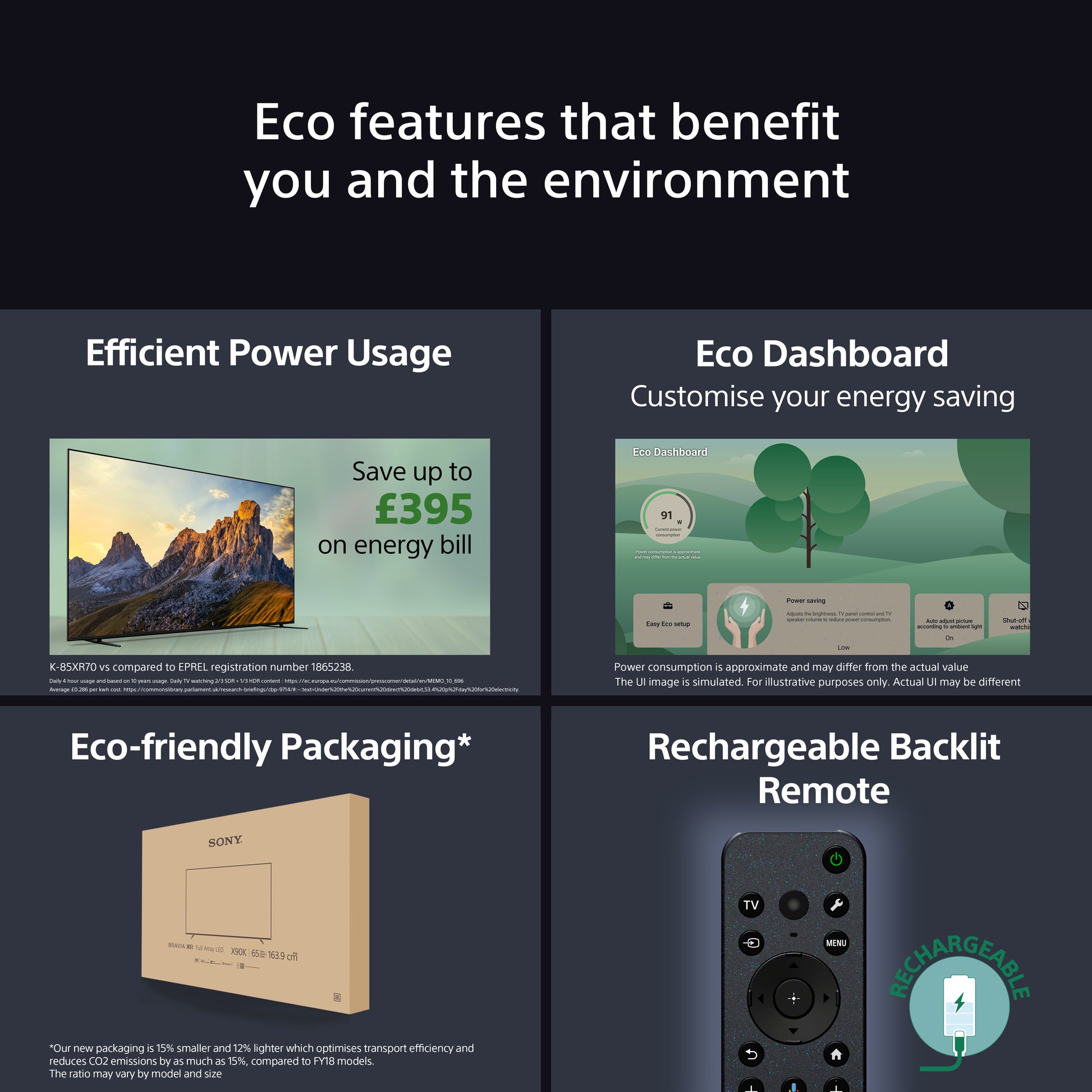 Made with the environment (and your energy bills) in mind, our new Eco Dashboard 2 puts all your energy settings in one place, and our XR Backlight Master Drive naturally helps lower your power consumption by only sending light to parts of the screen that need it, when needed. Overall, you could save you up to £395 on your energy bills with this television(9). The packaging is smaller and lighter to reduce C02 emissions(10).