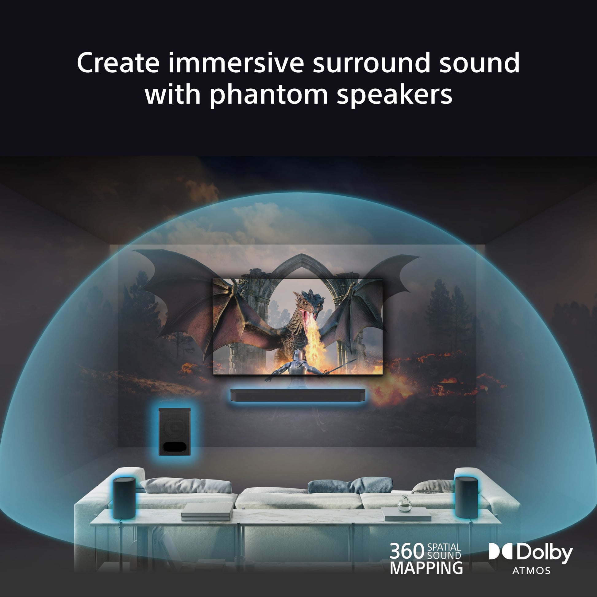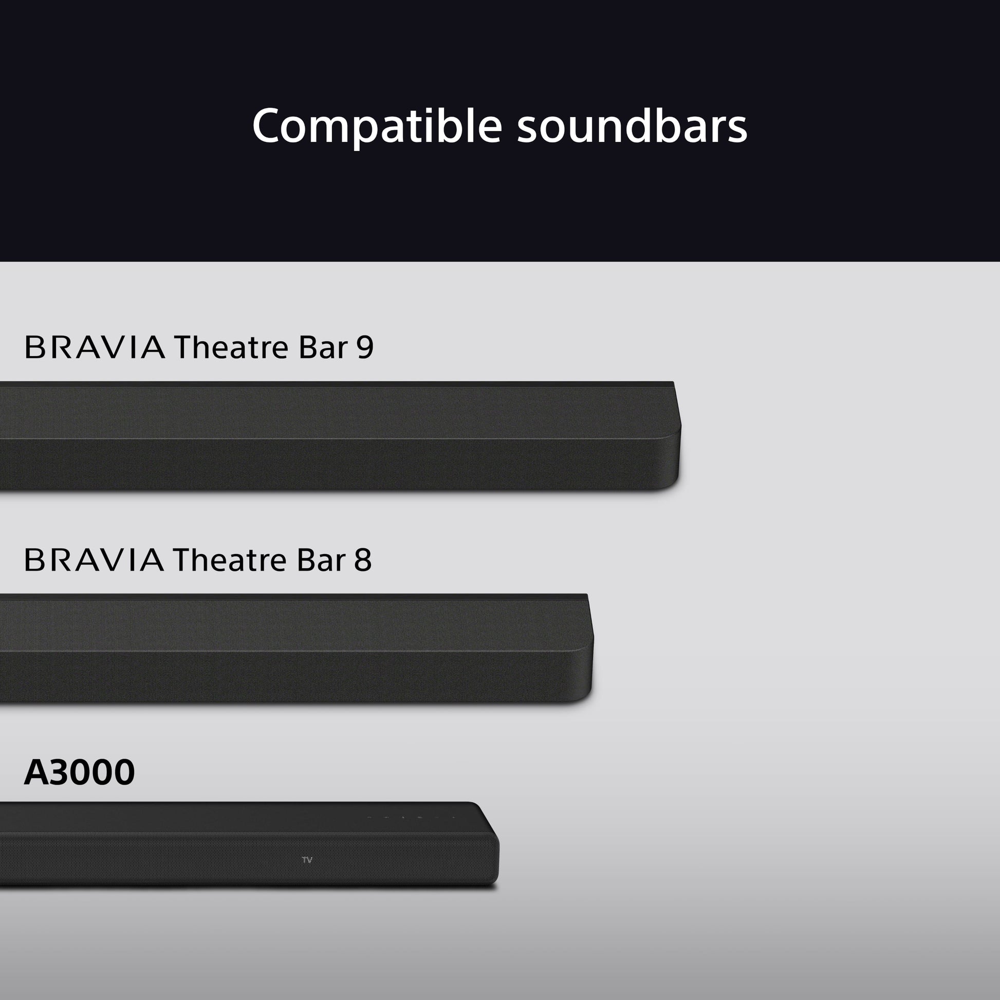 (1) This feature works with compatible models (BRAVIA Theatre Bar 9 / BRAVIA Theatre Bar 8 / HT-A7000 / HT-A5000 / HT-A3000). Product availability depends on regions and countries. Optional rear speakers may not be available in all countries and regions.