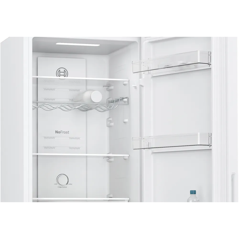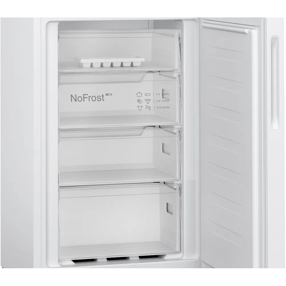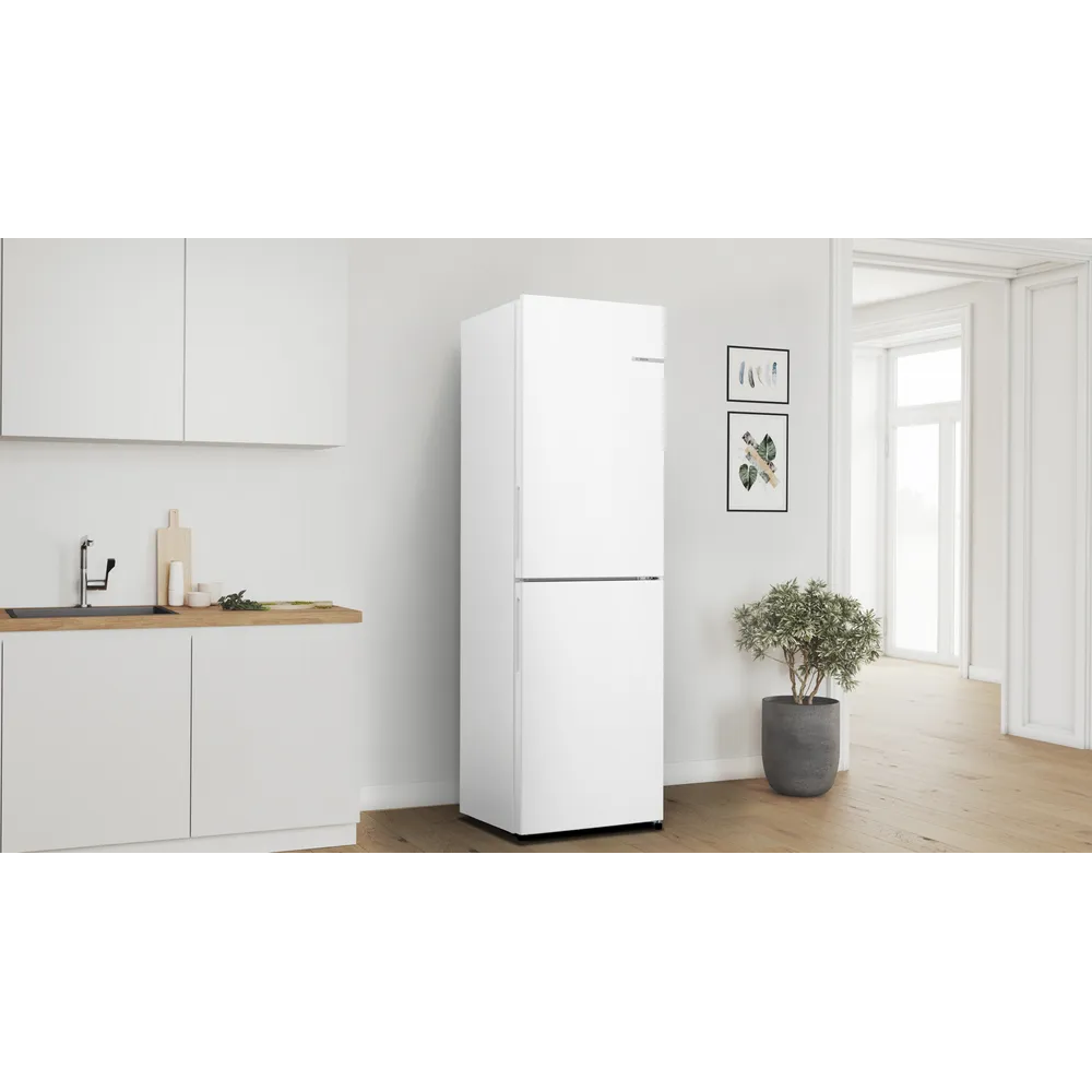 This Bosch fridge freezer has a stylish white finish and an impressive capacity to make it the ideal addition to any home. The NoFrost technology removes humidity from the air and prevents ice from forming inside the appliance. There’s also Multi Airflow technology in the fridge to ensure an even temperature. Small fans move cold air constantly, which helps foods retain their flavour for longer. Plus, the fridge has FreshSense technology which constantly monitors and controls the ambient temperature inside for perfect freshness every time.