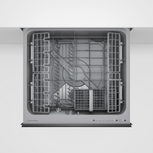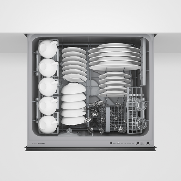 With capacity for 12 place settings, both drawers operate independently to support different wash cycles at the same time. Each drawer can run a true half load, offering flexibility for smaller or mixed loads. Six wash programs are supported by Quick, Sanitise, and Extra Dry modifiers, providing options for quicker turnaround, enhanced hygiene, or improved drying, particularly helpful for plastic items.