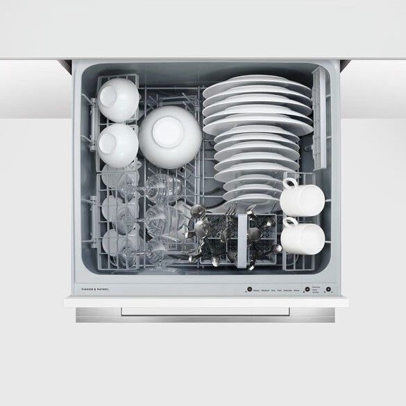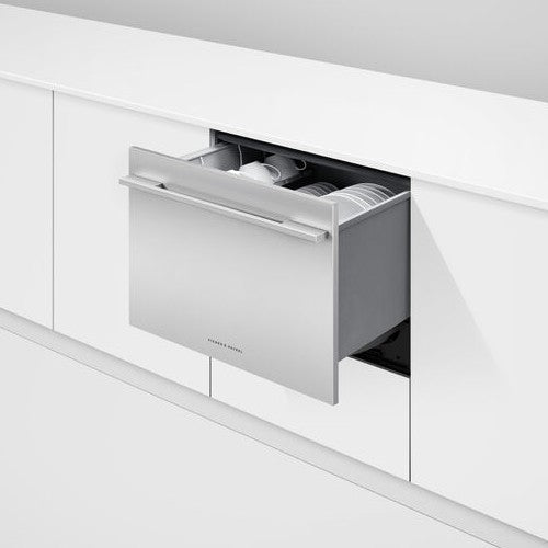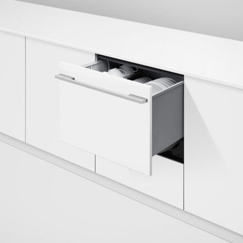 The Fisher and Paykel Integrated 8 Place Setting DishDrawer™ Dishwasher combines seamless built-in design with exceptional everyday convenience. Its tall-top-drawer construction provides extra height for larger dishes, while flexible, foldable racking makes it easy to customise the interior for plates, bowls, glasses and awkwardly shaped cookware.