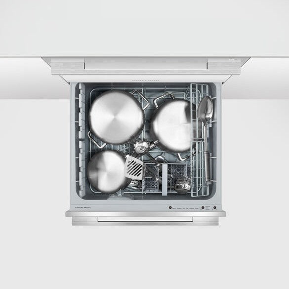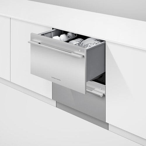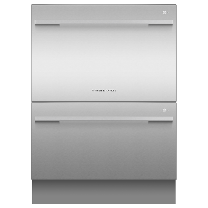 This Fisher and Paykel integrated Double DishDrawer dishwasher provides two independently operated drawers, allowing you to run one while loading the other or wash both at the same time. With capacity for 12 place settings, each drawer supports a true half load, offering efficient cleaning for both small and larger wash cycles.