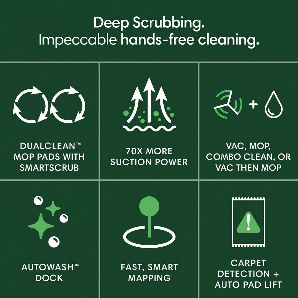 • Strong Suction. Serious Mopping. - Devours messes from crumbs to pawprints with 70x more suction, DualClean™ Mop Pads, SmartScrub, a multi-surface rubber brush, and edge-sweeping brush.