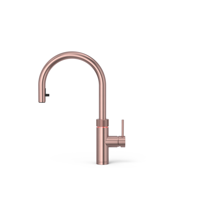 One tap for hot, cold, boiling, chilled and sparkling water with a double-walled, round spout. Fitted with a child-safe double push-turn control knob and with flexible pull-out hose for extra reach in the sink.