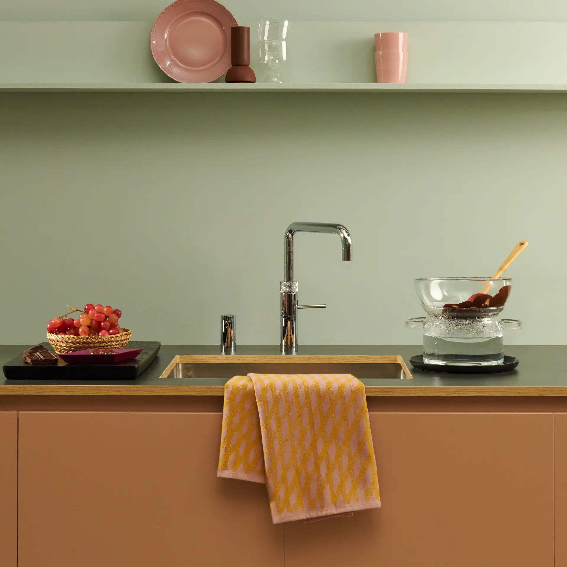 The water in the Quooker tank is heated to a temperature of 108 °C. The air in the insulated wall is so thin that the heat is unable to escape. It therefore takes very little energy (just 10 watts) to keep the water in the tank at 108°C. The water only starts to boil when the tap is turned on and the temperature of the outflowing water drops to 100°C. While the water is flowing out of the tap, fresh water immediately flows into the tank. A special active carbon filter inside the tank further purifies the water.
