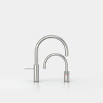 Two taps in the same design. A mixer tap for hot and cold water. The height of the boiling-water tap can be adjusted.