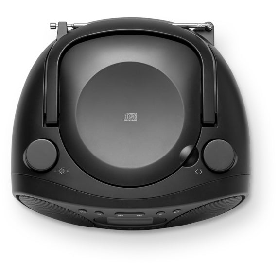A simple and intuitive portable FM/AM radio boombox housed in a sleek portable design with CD player, headphone socket and dual speakers for clear stereo sound.