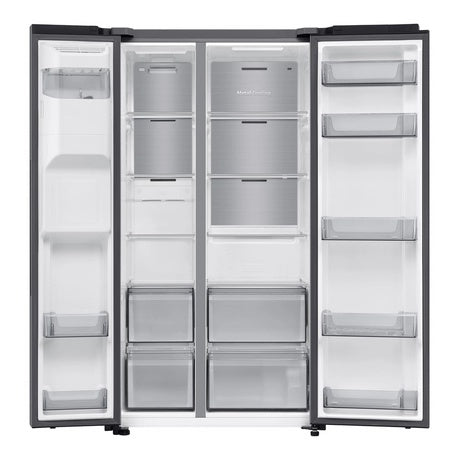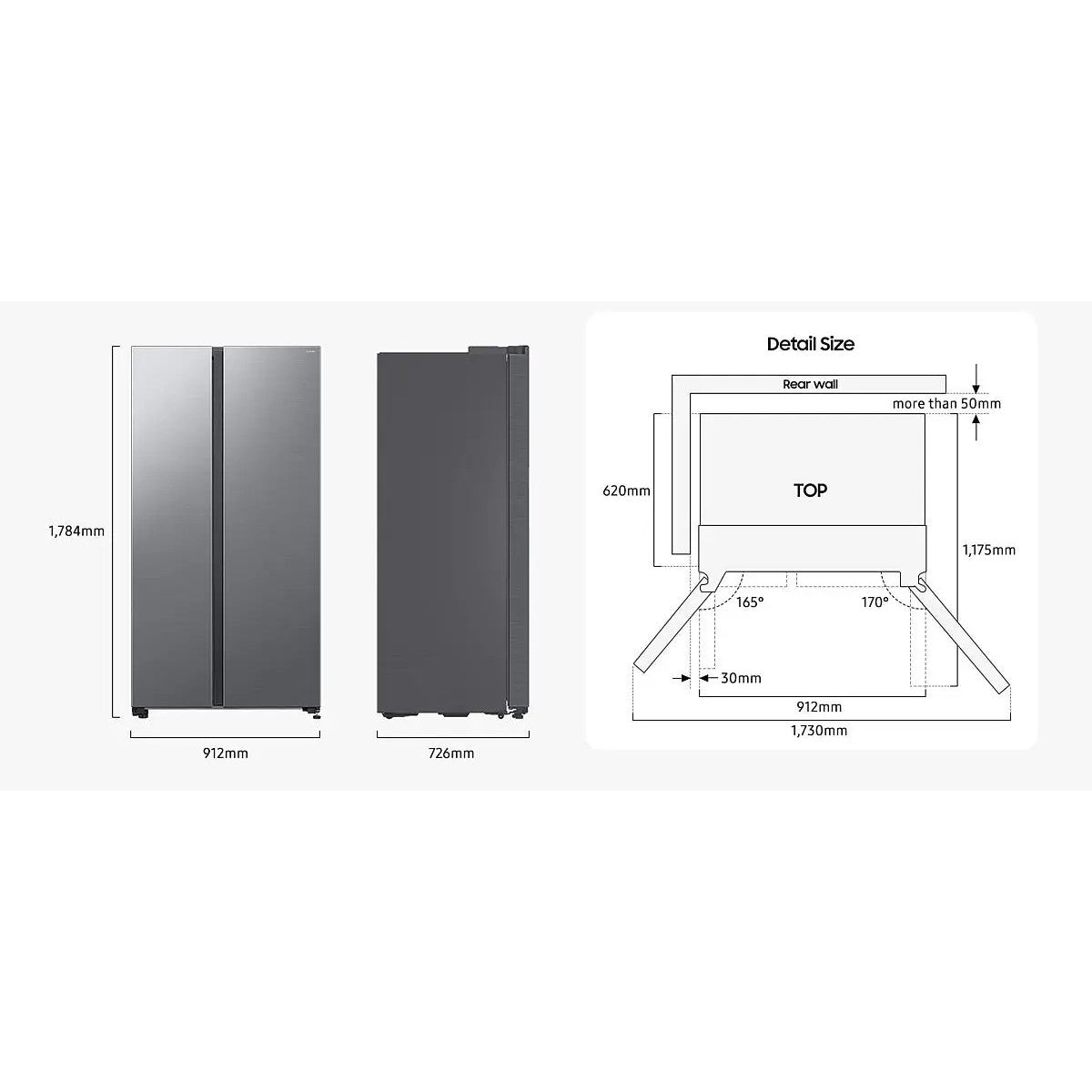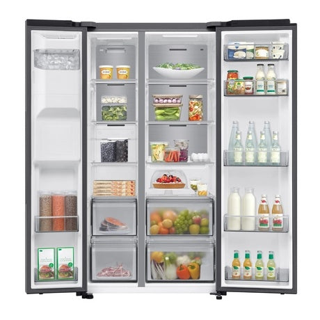 The Samsung RS70F64KETEU 91cm Side by Side American Fridge Freezer combines large capacity storage with modern cooling technology in a silver finish.