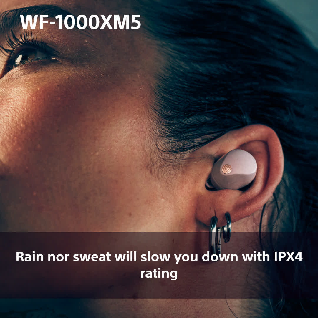 Also suitable to use as running or gym headphones, the WF-1000XM5 feature an IPX4 water resistance rating***, meaning splashes and sweat won’t stop them – so you can keep moving to the music.