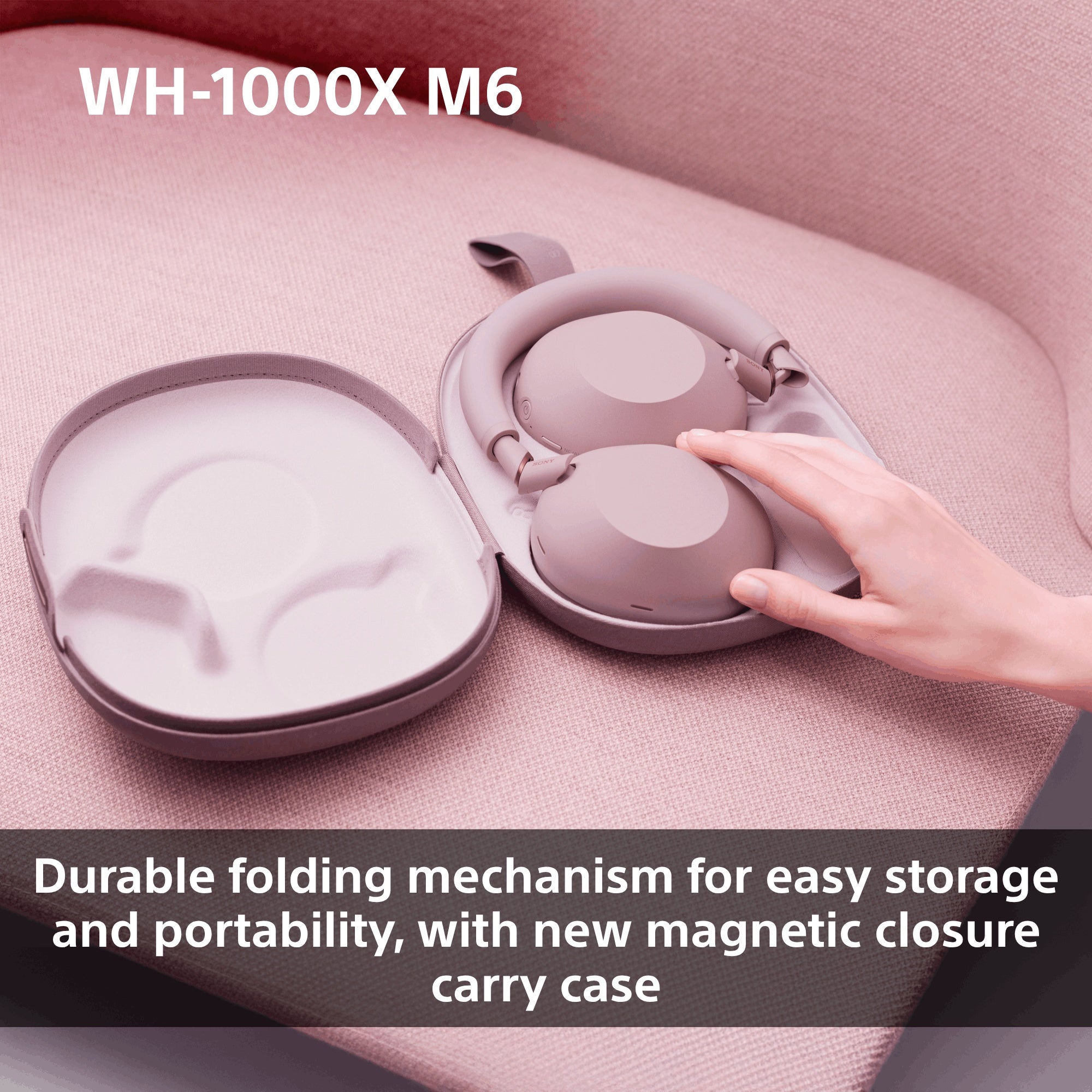 The WH-1000XM6 features an innovative folding mechanism with durable metal hinges, allowing the headphones to pack down into a compact size for easy storage and portability.